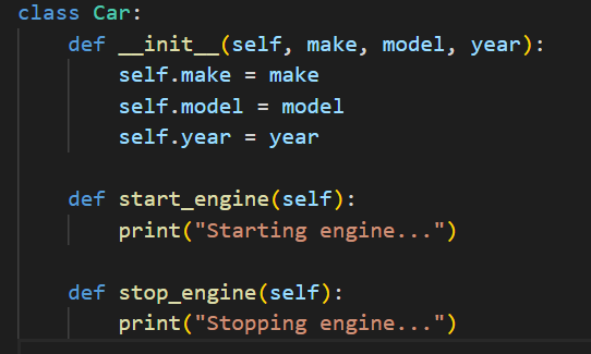 In this example, the Car class defines three attributes (make, model, and year) and two methods (start_engine and stop_engine).