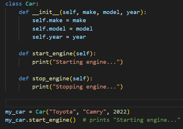 In this example, my_car is an object (instance) of the Car class that has its own make, model, and year data, and can perform the start_engine method.