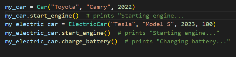 As you can see, the ElectricCar object inherits the start_engine method from the Car class and can also call its own charge_battery method. This allows us to reuse the code from the Car class and add more specific functionality to the ElectricCar class, without having to redefine everything from scratch.