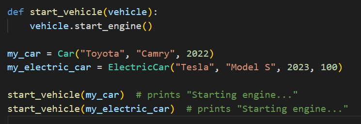 In this example, the start_vehicle function takes any object that has a start_engine method (which both Car and ElectricCar have) and calls that method on it, demonstrating polymorphism.