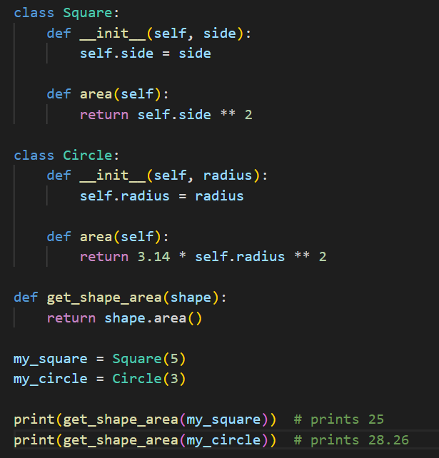 As you can see, even though my_square and my_circle are instances of different classes, we can still pass them to the get_shape_area() function and get their areas calculated in a polymorphic way. This makes the code more flexible and easier to maintain, as we can add more shapes to our program and calculate their areas without having to modify the get_shape_area() function.