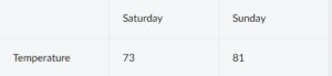 First, a new row was added to hold the three headings: a blank heading, a Saturday heading, and a Sunday heading. The blank heading creates the extra table cell necessary to align the table headings correctly over the data they correspond to. The table will be rendered as follows: