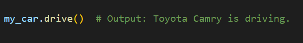 This will print out the message “Toyota Camry is driving.” since the drive method is defined to print out that message.