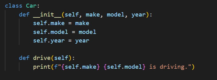 In this example, we define a Car class that has three attributes (make, model, and year) and one method (drive). The constructor method takes three arguments (make, model, and year) and initializes the corresponding attributes of the object using the self keyword.